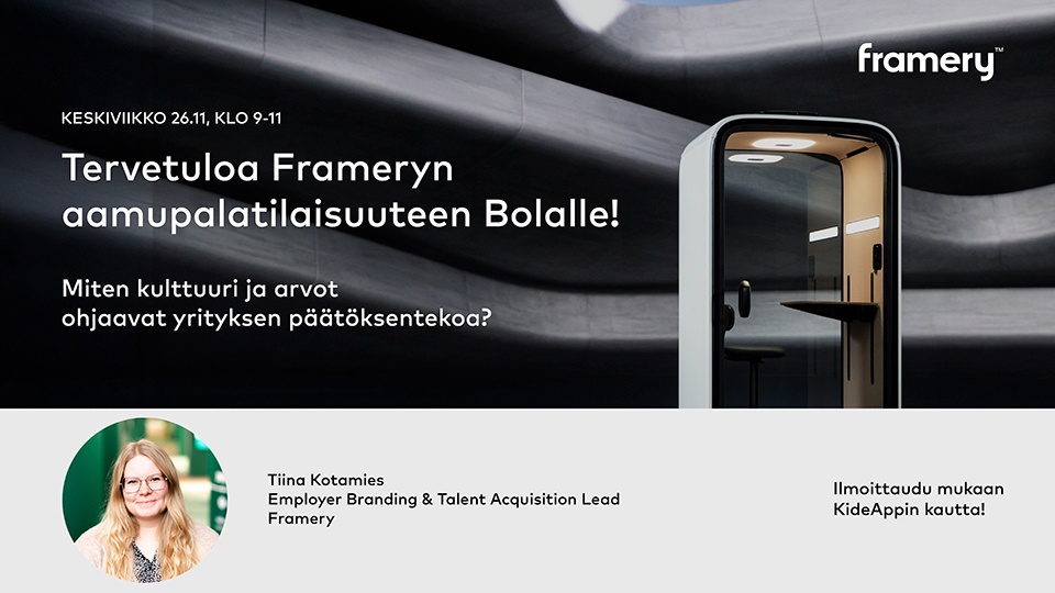 Aamu Frameryn seurassa! Tervetuloa aloittamaan päivä inspiroivasti, kun Framery:n Employer Branding & Talent Acquisition Lead Tiina Kotamies saapuu ainejärjestömme tiloihin